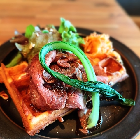 当店の自慢の看板メニューのワッフルはオリジナルのブランド粉を使用しております。ランチはおかず系のお食事ワッフルをご提供しており、ローストビーフや週替わりメニューもご用意。スイーツは、チョコバナナワッフル、プレーン、アーモンドキャラメル、ティラミス風など