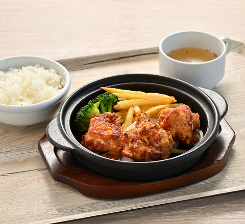 ハンバーグもカレーもザンギも食べられるよくばりなセット!【ファイヤーバーグ150g、ザンギ1個、ミニカレー、ご飯食べ放題、スープ付き】