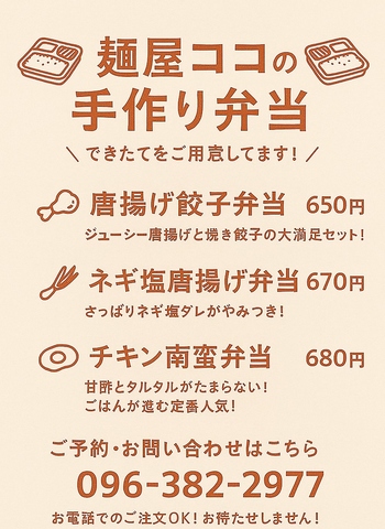 お弁当の販売を始めました!ご飯のススムおかずの数々!注文を受けてから作るため、出来立て熱々♪