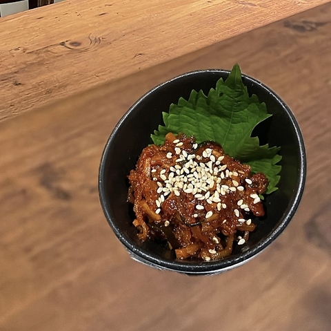オリーブオイル漬けのキムチを豆腐に乗せ、ユッケ風に仕上げました。一度食べたらハマること間違いなし!