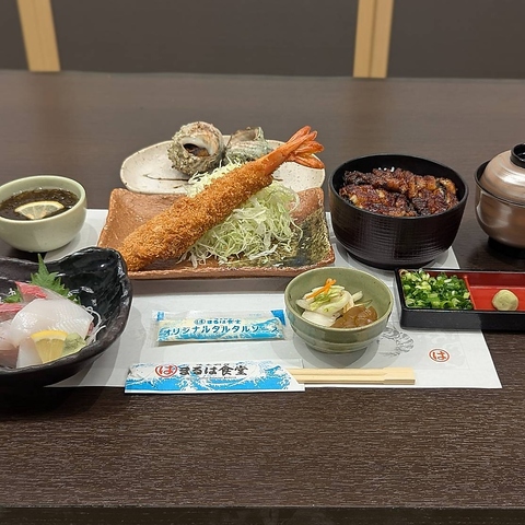 当店人気の定食は「山安コラボ定食」★まるは食堂系列人気のエビフライや三河一色産ブランド鰻"三河鰻咲"(みかわまんさく)を含む全6品を堪能できるセットが3685円(税込)でご提供しております◎海の幸をふんだんに使用した贅沢な定食をどうぞ!※曜日問わずご提供可能◎