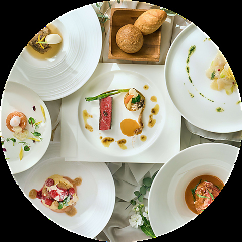 バンケットホールの大きな窓から差し込む自然光が、店内を明るく開放的な雰囲気に。シーンに合わせて照明やインテリアの演出が可能で、ランチは爽やかに、ディナーは落ち着いたムード漂う空間へと変化します。特別な日を彩る優雅な雰囲気の中で、心に残る時間をお過ごしください。