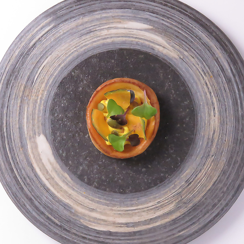 パスカードとは、小麦粉、卵、牛乳をベースにしてオーブンで焼いた生地のこと。その上にさまざまな料理をのせて食べる、フランス中南部オーベルニュ地方の郷土料理です。フランス料理が初めての方から食通の方までお楽しみいただけます。是非、コース料理の一番最初からご注目ください!