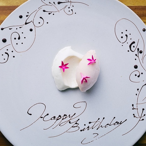 コースメニューのデザートをメッセージ入りのデザートプレートに変更することが可能です。大切な人の誕生日や記念日を祝う食事の席にもオススメ。おいしい時間を共有し、思わず笑みがこぼれます。是非、大切な方と記憶に残る食事をお楽しみください♪