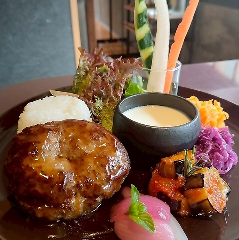 ジューシーなむなかた牛ハンバーグを主役に、色とりどりのサラダ、温かいスープ、ご飯が添えられた豪華な一皿です。新鮮な野菜やおいしいソースが、食欲をそそります。見た目も鮮やかで素敵なごはん時間にぴったりです♪
