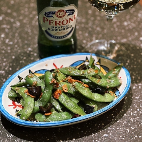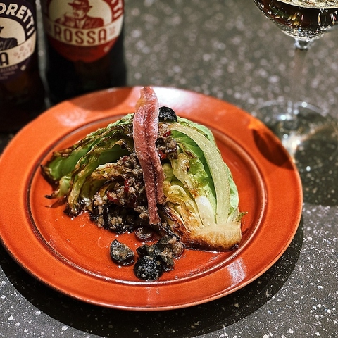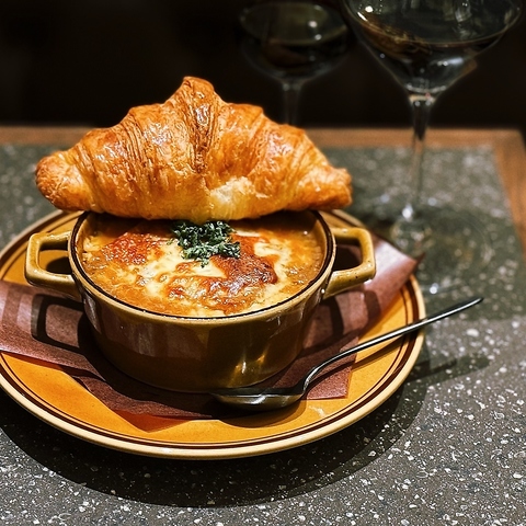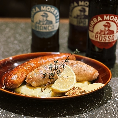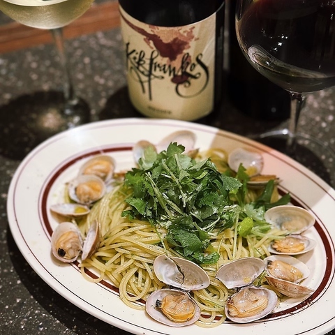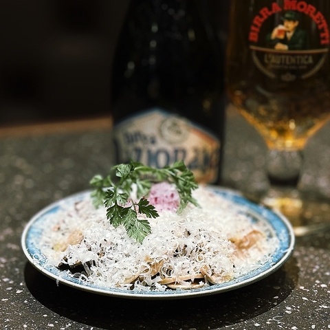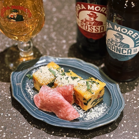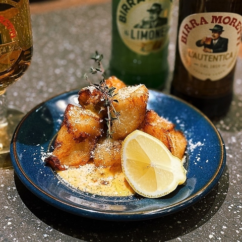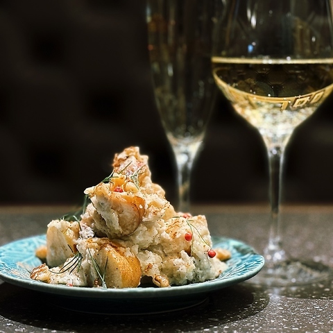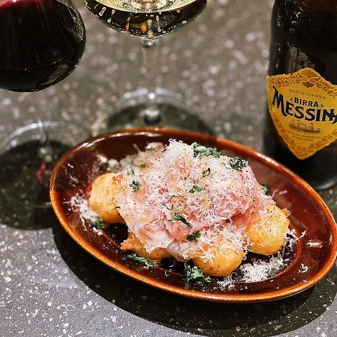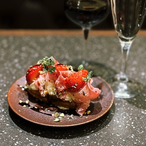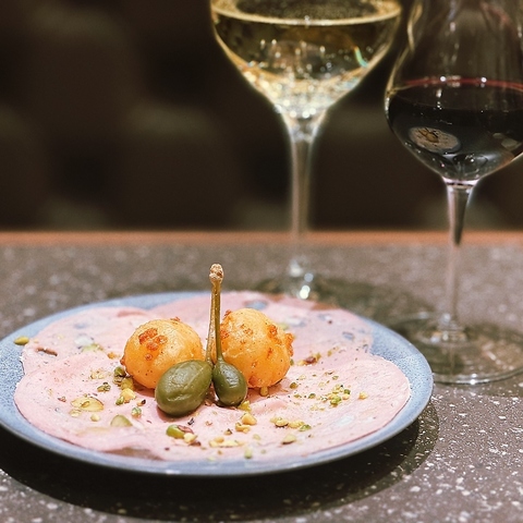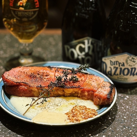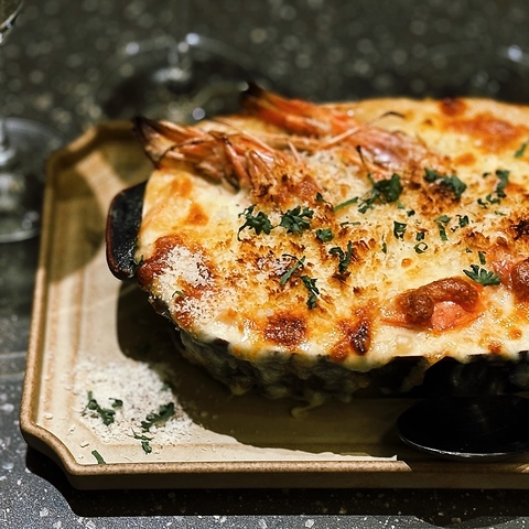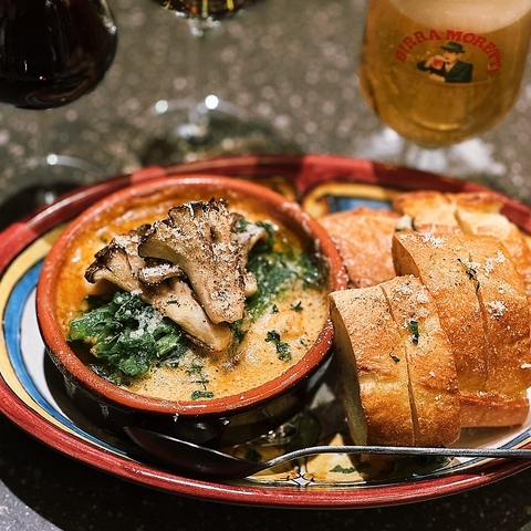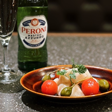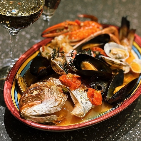 香り豊かな真鯛と新鮮な魚介を贅沢に使った「漁師風アクアパッツァ」は、海の恵みを存分に堪能できる一皿!ハーブの風味が魚介の旨味を引き立て、口に広がる味わいはまるで地中海の潮風を感じるかのよう。真鯛のふっくらとした身と貝類の旨味がスープに溶け合い、ワインとの相性も抜群です。