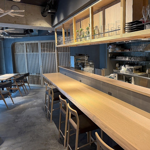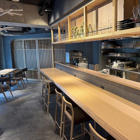 【カウンター席で楽しむリラックスタイム】モダンで落ち着いた雰囲気の中、6席のカウンター席をご用意しております。大切な方とふたりきりのお食事にも最適な空間です。二人の時間を大切にしながら、美味しい料理とお酒をお楽しみください。ゆったりとした時間を過ごし、心地良いひとときをお過ごしいただけます。