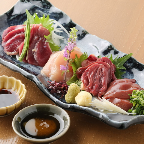 厳選し仕入れを行った京赤地どりの新鮮なズリ、こころ、ささみ、キモの4種のお造り盛り合わせ!各部位ごとに食感や旨みが異なる新鮮なお造りをお楽しみいただけます!薬味と合わせると旨みが更に引き立ちます!