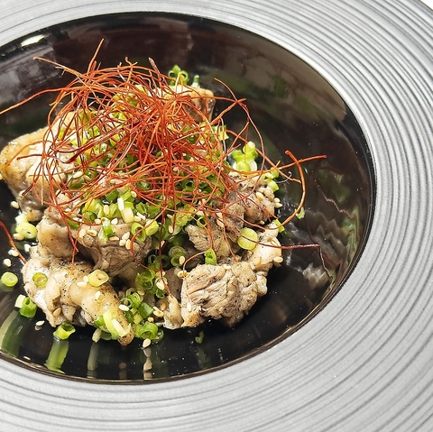 ぷりっと弾む首肉“せせり”を香ばしく炙り、山盛りの青ねぎで包みました。甘い脂と葱の清々しさの相性は抜群です!後味は軽やか、箸が止まらない一皿です。