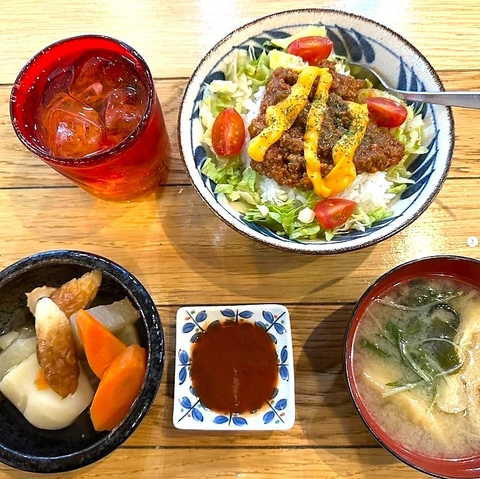 沖縄の人気グルメ「タコライス」もございます!ご飯の上にスパイシーなひき肉、シャキシャキのレタス、フレッシュなトマト、そしてとろけるチーズがたっぷりトッピングされたボリューム満点な一皿は、まさに沖縄の味の宝庫♪異国情緒あふれる風味は、一口食べればやみつきになること間違いなし!ぜひご賞味あれ♪