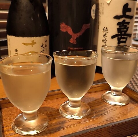 女将おすすめの日本酒を3杯(税込1500円前後)お楽しみください。気になることはお気軽にお声掛けを。