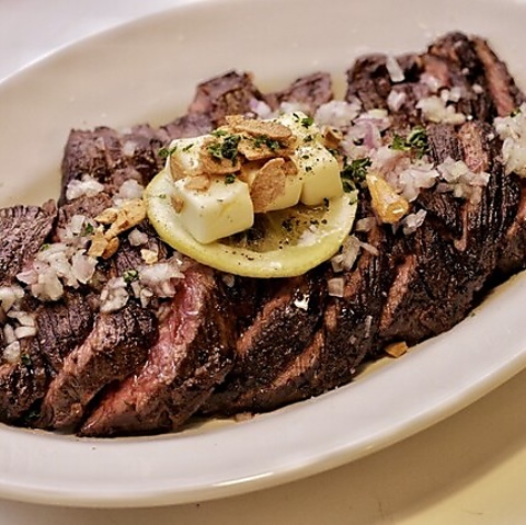 肉好きにはたまらない1ポンド(約450g)の豪快なボリューム!上質なUS産ブラックアンガス牛のハラミを、旨みを閉じ込めて焼き上げたステーキです。赤身の濃厚な旨みと、ハラミ特有のやわらかくジューシーな食感が格別!仲間とシェアするもよし、一人で贅沢に堪能するもよし、大満足間違いなしの逸品。Halfサイズ4,000円(税込)