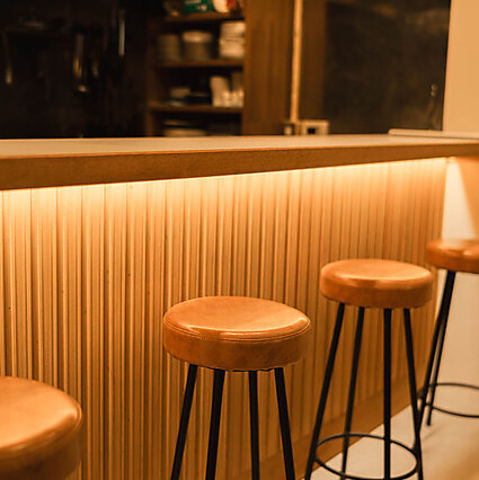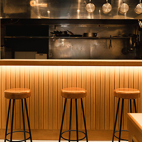臨場感あふれるキッチン前のカウンター席は、お一人様や二軒目利用に最適です。シェフの調理風景を眺めながら、出来立ての料理をすぐに楽しめます。木の温もりと間接照明が織りなす大人の雰囲気の中、ちょい飲みやサク飯にご利用ください。