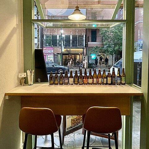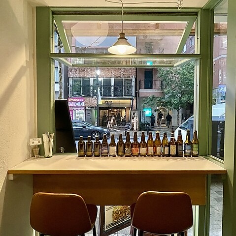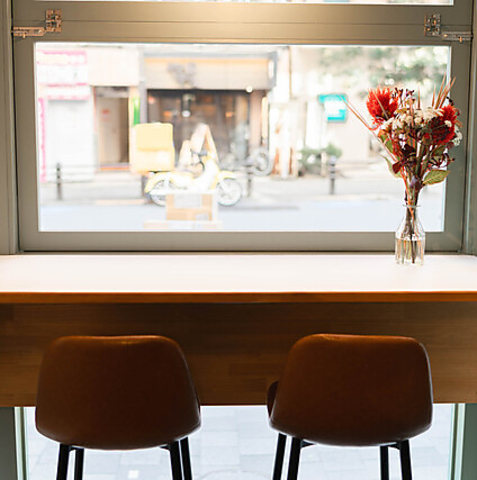 通り側のカウンター席は、窓の外の景色を眺めながらゆったりと過ごせる特等席です。お洒落なボトルが並ぶ空間は、お一人様やカップルにおすすめ。開放感のある窓辺で、ランチタイムにはプレートを、夜はお酒と共に料理を気軽に楽しんでいただけます。