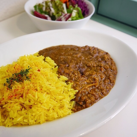 合挽き肉と鶏もも肉の3種のお肉を使った濃厚カレー。オニオンソテーと赤ワインのコクに、肉の旨みが溶け込んでいます。(サラダ付)