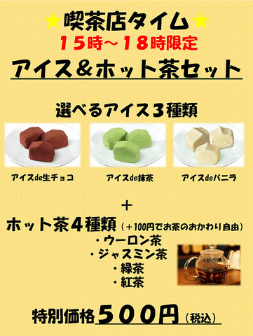 15時~18時限定☆選べるアイス(3種)+ホット茶(4種)税込500円\(^o^)/+100円でホット茶おかわり自由