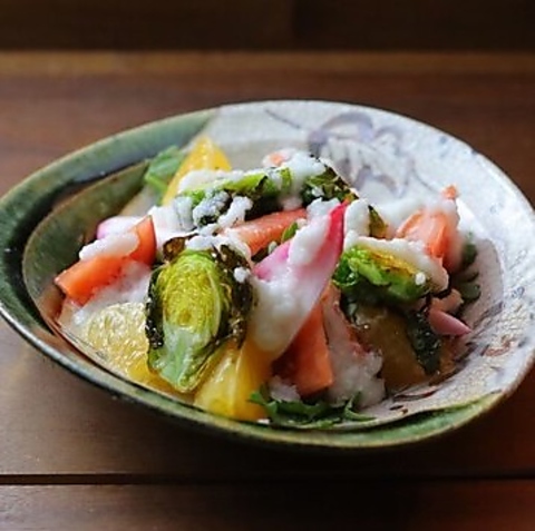 自家製の玉ねぎドレッシングが絶妙なサラダ。春菊が苦手な方もおすすめです。