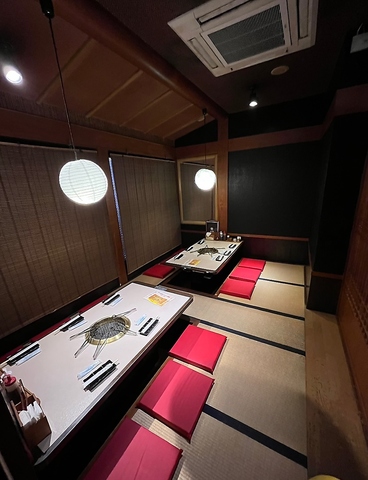 【掘りごたつ席で和のひととき】和の趣が漂う掘りごたつ席は、足をのばしてゆったりとくつろげる人気の空間。畳と座布団の温かみが心を落ち着かせ、家族の団らんや大切な人との食事にもぴったりです。壁には大きな焼肉の写真が掲げられ、食欲をそそる演出も◎。落ち着いた雰囲気の中で、心ゆくまで焼肉を堪能できます。