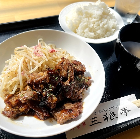 三狼亭の新定番!特製のたれが染み込んだラム肉の焼肉定食です!柔らかいお肉の旨みが、噛むごとに口に広がります・・・!食べ始めたら止まらない、ナムルと一緒に◎ 肉倍盛(+300円)、ご飯の大盛(+100円)なども可能です◎