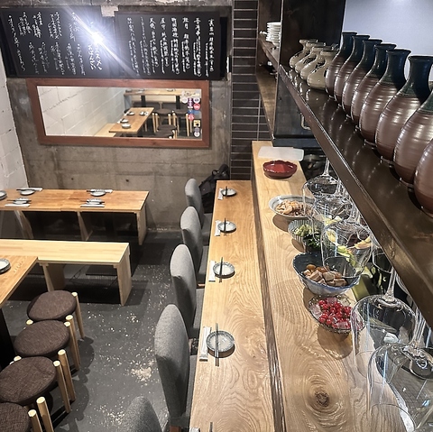 【落ち着いた雰囲気の中でゆったり過ごせます◎】雰囲気抜群の空間には、お洒落なおちょこや小皿が並び、心地よいひとときを演出します♪木の温もりが感じられる内装に、照明が柔らかく灯り、リラックスした時間が過ごせる隠れ家のような雰囲気で、仕事帰りのチョイ飲みから会社宴会まで様々なシーンでご利用いただけます◎