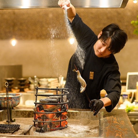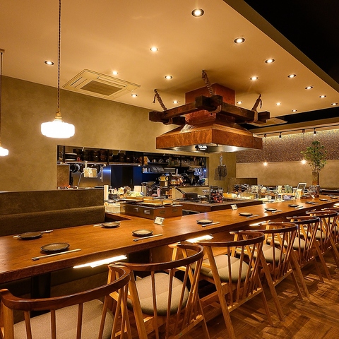 【カウンター席からは臨場感のある調理風景が見えます!】10席ございますカウンター席は少人数からご利用しやすく、横並びで食事や会話をお楽しみいただけますのでチョイ飲みにも最適♪カウンターの目の前には調理台があり、炉端焼きを焼き上げる様子などをライブ感をもってお楽しみいただけます。お気軽にご利用ください!