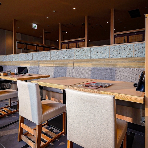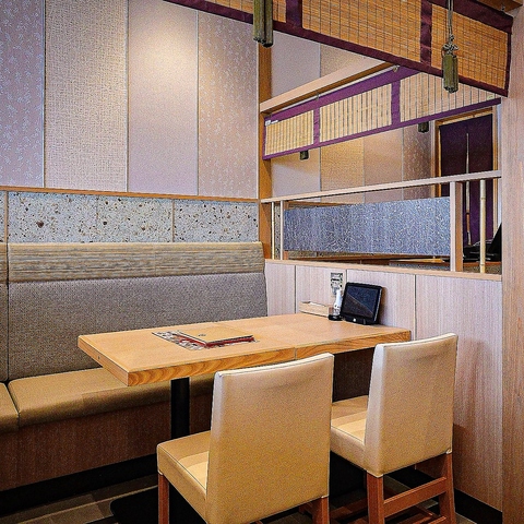 【和の趣とモダンが融合した癒しの空間】木の温もりを感じる店内は、京都の町家をどこか思わせる落ち着いた雰囲気。障子や格子を取り入れたインテリアが、和の美しさを演出します。広々としたテーブル席や半個室もあり、ゆったりと食事を楽しめる空間。昼は自然光が差し込み、夜は柔らかな照明が心を癒します。