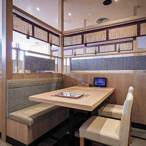 【ゆったりとした時間が流れる、癒しの和空間】店内は広々としており、テーブル間の距離もゆったり。周囲を気にせず会話や食事を楽しめる設計です。木の質感と和紙の柔らかな光が、心を落ち着かせてくれます。お一人様からご家族連れまで、誰もが安心して過ごせる空間づくりがされています。