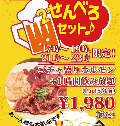 【平日17時~19時、21時~22時限定★】1時間飲放+大人気ごちゃ盛りホルモンがセットで大特価1980円★