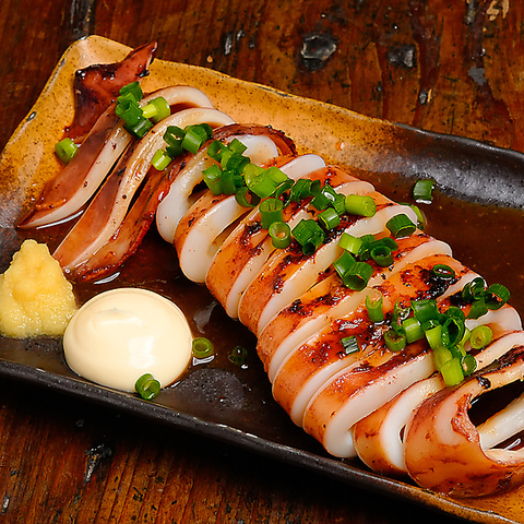 おすすめメニュー・イカの姿焼きは、まず、その大きさに思わず目を奪われます!しっかりと香ばしく焼き上げて、食欲をそそるタレの香りがたまりません♪食べ応えばっちりなイカは噛み締めるたび、口の中で旨みが広がります。仲間とシェアして楽しむのも◎海の幸を存分に味わえる一皿です♪
