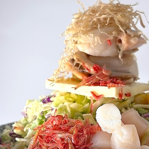 新鮮なキャベツ、魚介類を口に入れた際の食感にこだわり、それぞれの切り方を探求したもんじゃです。