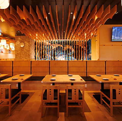 波を模した格子の装飾が印象的な、洗練された和空間。明るい木材を使用したテーブルや椅子が清潔感と温もりを感じさせます。壁のアートや照明が控えめながらも華やかさを演出し、友人との語らいやカジュアルな食事にぴったりの席です。居心地の良さが長居を誘う空間です。