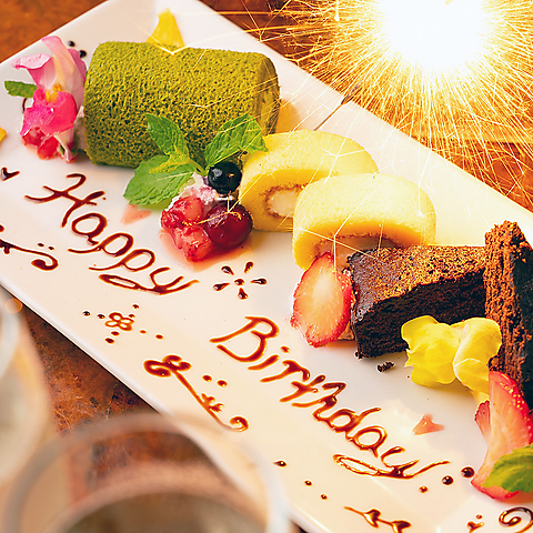 説明文(居酒屋向け):誕生日や記念日のお祝いにぴったり!当店では、華やかなデザート盛り合わせにメッセージを添えた「バースデープレート」をご用意しております。スイーツの盛り付けとサプライズ花火で、思わず笑顔がこぼれる特別なひとときを演出。ご予約時にメッセージ内容のご希望も承ります。大切な人とのお祝いは、ぜひ当店で!