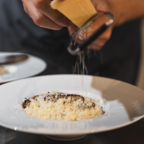 じっくり木の子に火を入れたリゾットは香り高いチーズを削りながら仕上げる一皿をなっております。当店のワインとぜひお楽しみください。