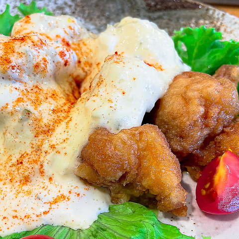 外はサクッと香ばしく、中はジューシーな鶏肉に、甘酢ダレとタルタルソースをたっぷり絡めた自慢の一品です
