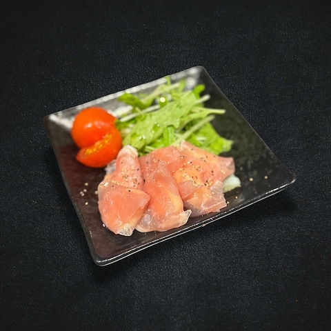 おりーぶ地鶏のむね肉をタタキにしてご提供しております♪旨味や風味は癖になること間違いなし!!