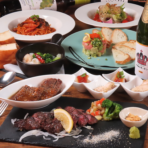 シェフのこだわりが詰まった満足コース!前菜・カルパッチョ・アヒージョ・ステーキ・パスタ・デザートなど全7品飲み放題付きで5500円♪宴会でのご利用はもちろんデートや普段使いにも最適なコースとなっております。料理にもこだわりが詰まったコースですので是非ご利用ください!