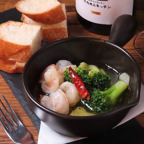 ぷりぷりのえびと彩り豊かなブロッコリーを、にんにく香る熱々のオリーブオイルで煮込んだ自慢のアヒージョです。素材の旨みが溶け出したオイルは、添えられた香ばしいバゲットとの相性も良い!お酒が進む逸品です。