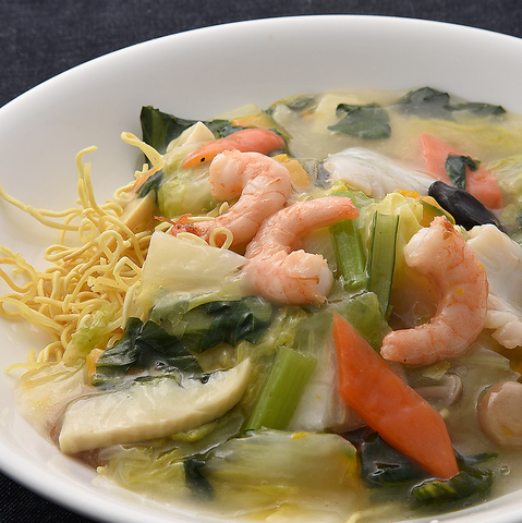 金龍閣の伝統の味である『海鮮焼きそば』は、創業50年間ずっと愛され続ける看板メニュー。海老やいかなど海の幸とたっぷりの野菜をとろみのあるあんかけに。あんが麺にしっかり絡み、一度食べれば虜になる一品です。