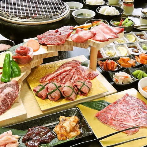 落ち着いた、高級感あふれるゆったりとした空間で信州プレミアム牛と日本三大和牛、松坂牛、米沢牛、神戸牛など高品質で上質なお肉を楽しむことができる焼肉です。名物の数量限定ネギ塩包み牛タン、焼きすき、壺漬けハラミ、日本三大和牛ロース食べ比べは特におすすめの一品です。