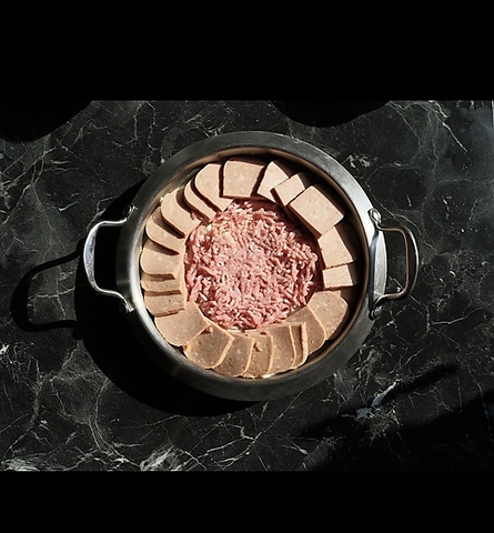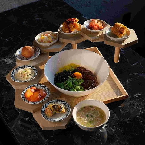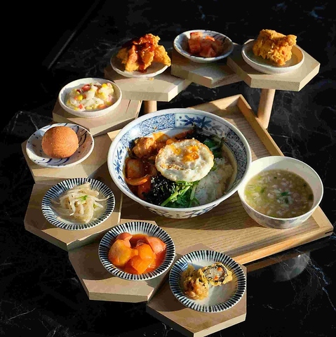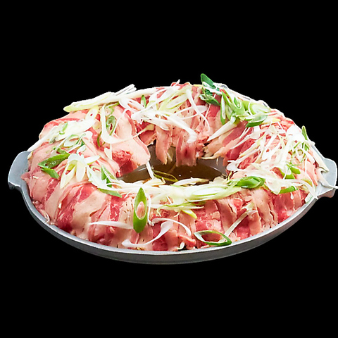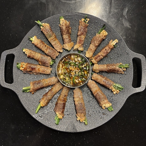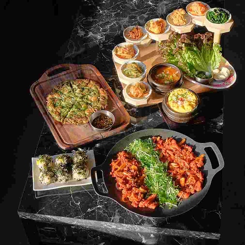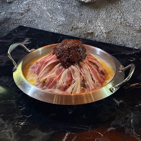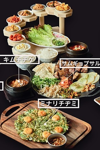 藁の香りをまとわせたサムギョプサルを鉄板で焼き、きのこ・もやし・玉ねぎ・ニラの和え物・炒めキムチ・トルティーヤを鍋蓋の上に盛り付けてご提供します。