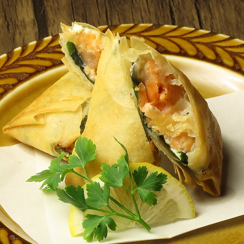 サーモンの旨みと大葉の香りが相性抜群!パリッと香ばしい春巻きの中から、サーモンの旨みと大葉の風味がじゅわっと広がる!