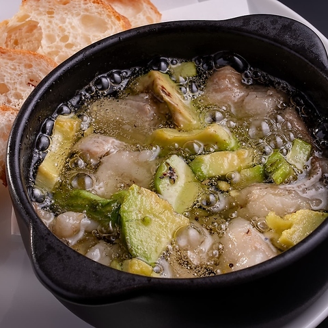 アボカドとホルモンのアヒージョは、香ばしいオリーブオイルが食材の旨味を引き立て、お酒との相性も抜群!