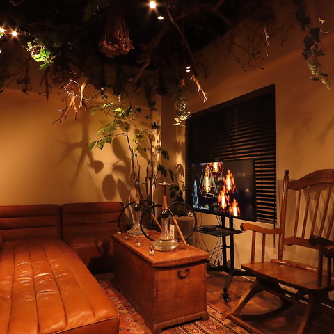 リラックスできる隠れ家のような落ち着いた雰囲気を大切にしています。温かみのあるインテリアと植物の緑が心を和ませる空間で心地よいひとときをお過ごしいただけます。こだわりの照明が醸し出すムードの中、友人と楽しい会話を楽しんだり、一人で静かにシーシャを堪能したり、さまざまなシーンでご利用可能です。