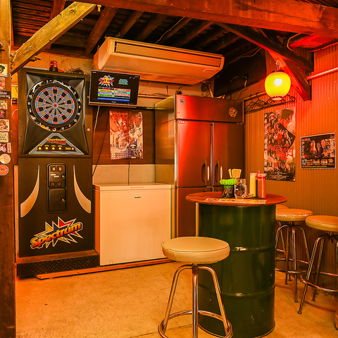ダーツが楽しめる居酒屋ゾーンでは、ドラム缶をテーブルに使用しており、懐かしさたっぷりのユニークな空間をご提供しています。昭和レトロな雰囲気を存分に味わえる気軽なお席で、友人や仲間と楽しいひとときを過ごすことができます。お酒やおつまみを片手に、ダーツを楽しみながら、思い出に残る時間をお過ごしください。
