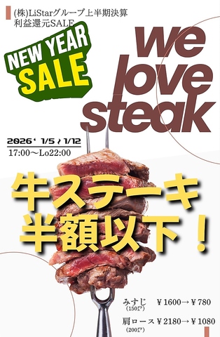 【we love steak!1/5~1/12期間限定♪】牛ステーキ半額以下!