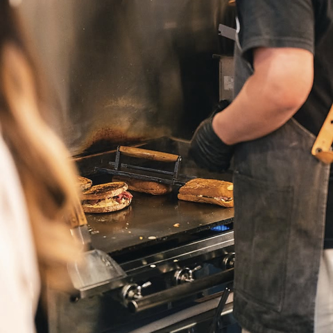 熱々のグリルで仕上げるサンドイッチは外はカリッと香ばしく、中はジューシーな具材がたっぷり◎