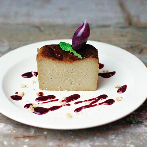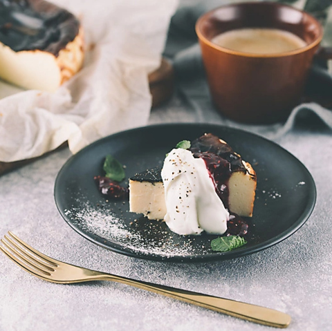 当店の人気No.1スイーツ。こんがりとカラメルのように焼き上げや表面。内側はしっとりクリーミーなチーズケーキ。トッピングに生クリームとブラックペッパーをおつけしています。