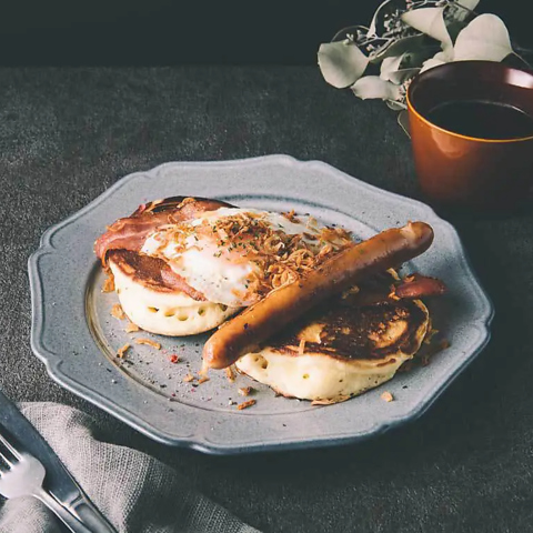カリカリベーコン、ウインナー、目玉焼き、フライドオニオンとメイプルシロップたっぷりのパンケーキ甘くて塩っぱいアメリカンな一皿です。