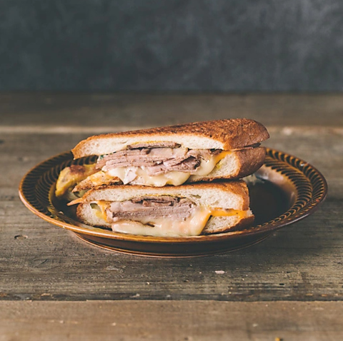表面をバターでカリッと焼き上げたバケットの中には自家製のローストポーク、ハム、ピクルス、マスタードにたっぷりのチーズが入ったキューバ発祥のサンドイッチ。チリソースと共にお召し上がりください。