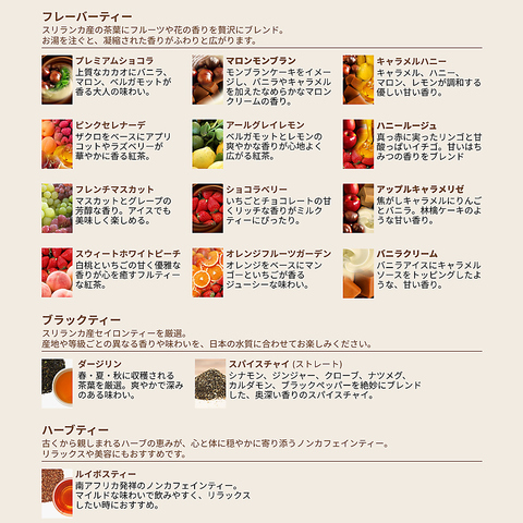 AMSU TEAの15種類のフレーバーティーからお好みの一杯をお選びいただけます。華やかな香りと豊かな味わいで、心ゆくまでティータイムをお楽しみください。